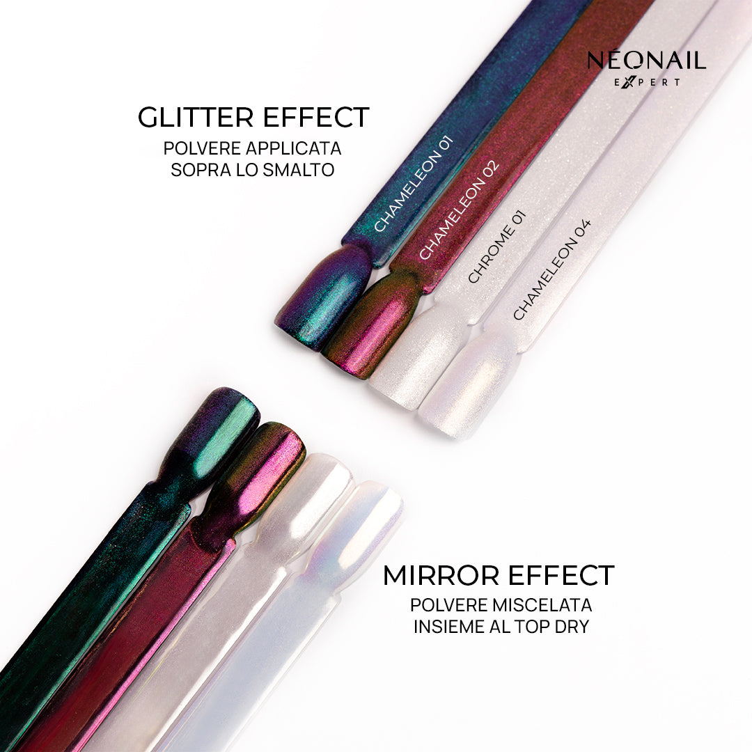 Puoi ottenere un effetto specchio strofinando la polvere su Dry Top già polimerizzato, oppure creare un effetto glitter applicandola su smalto indurito e lasciandola asciugare per 10 secondi.