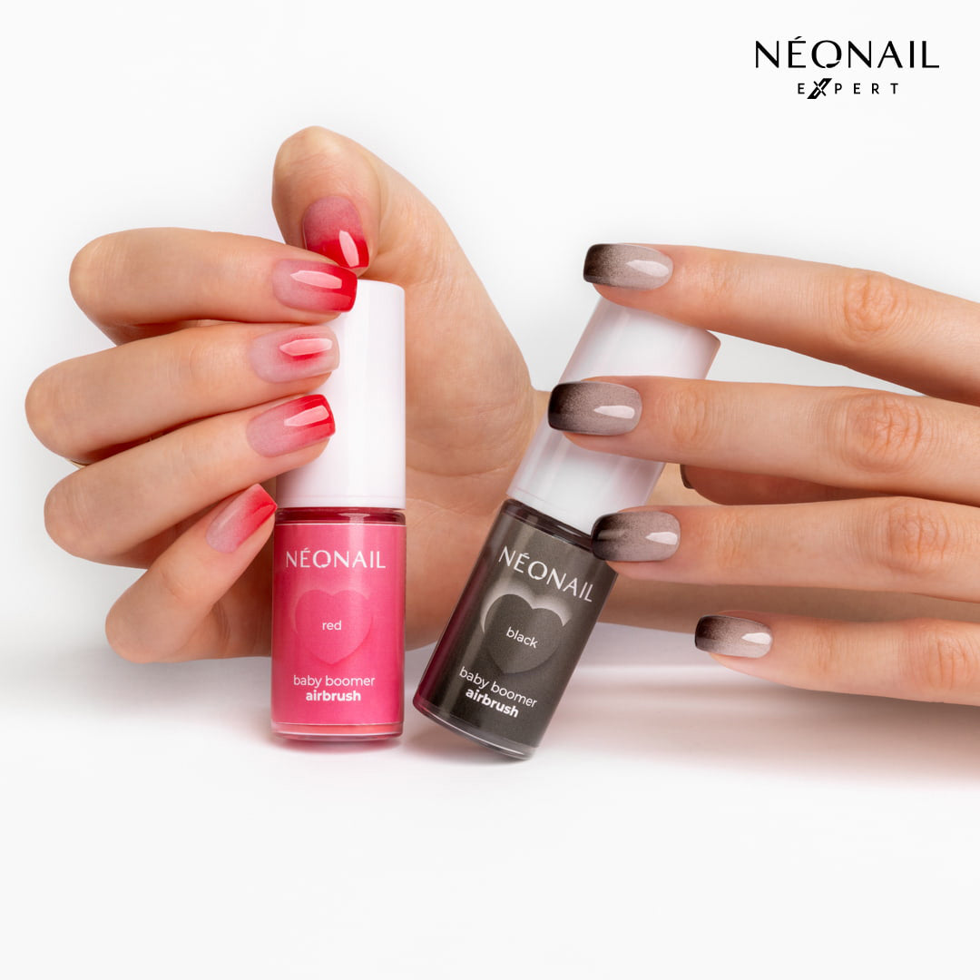 Neonail Expert consiglia l'uso abbinato a una base Cover Protein. Applicare Baby Boomer Air Brush Black nebulizzandolo sulla dispersione dei prodotti da circa 8/10 cm di distanza dall'unghia per creare la sfumatura. Per intensificare l'effetto sul bordo libero, diminuire la distanza. Sigillare con un top al termine dell'applicazione.